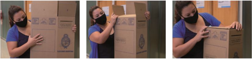 El Presidente o Presidenta de mesa y el Vicepresidente o Vicepresidenta (vocal) desinfectarán la mesa receptora de votos; la colocarán en un lugar visible y de fácil acceso, y la identificaran con su número; finalmente, dispondrán sobre ella los ejemplares del padrón; fijarán la cartelería; y armarán la urna de votación.