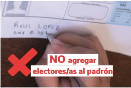 - Estar inscripto o inscripta en el padrón de la mesa: No podrá agregarse al padrón a ningún elector o electora, fiscal, Autoridad de Mesa ni personal afectado a los comicios. Quien no esté inscripto o inscripta en el padrón no podrá votar.